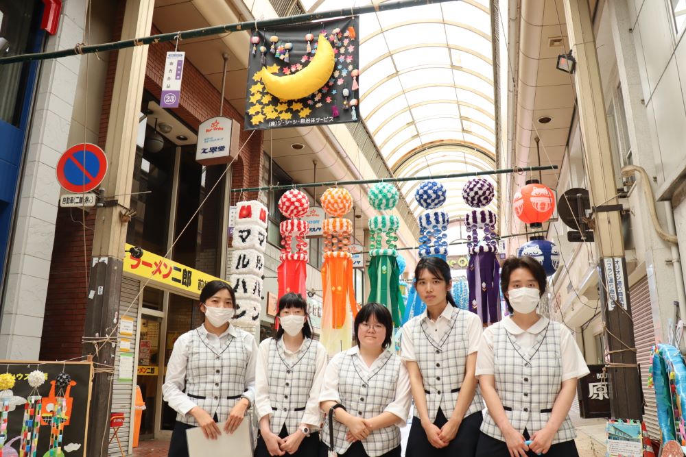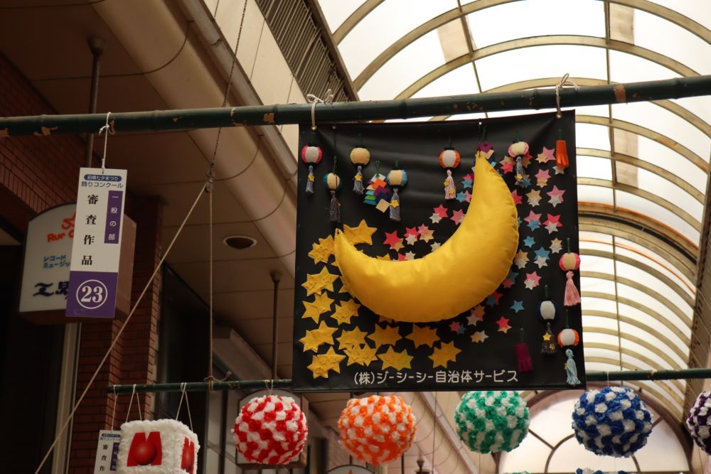 数多くの七夕飾りの中からその出来映えを競うコンクールも行っており、今回、当社の障害者雇用の従業員が中心となって飾りを製作し、参加いたしました。作品のテーマは「大きな月の吊るし飾り」と決め、皆で協力して作りました。背景の天の川や吹き流しもポイントになっています。